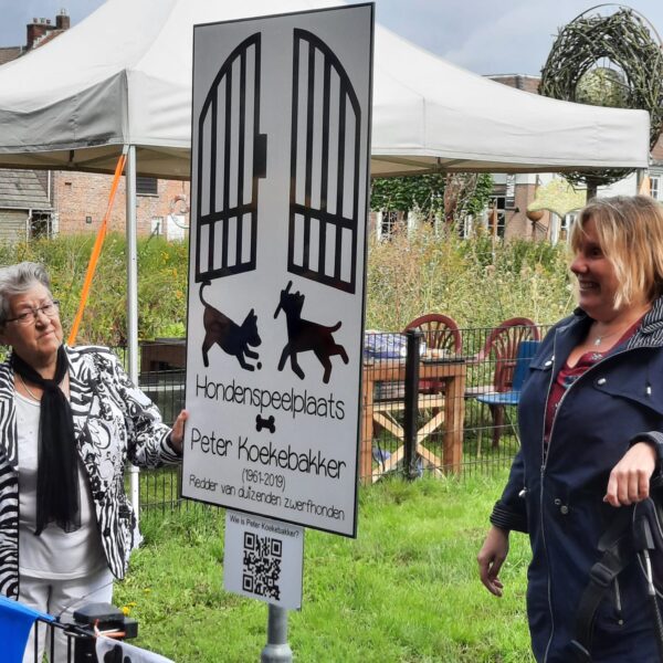 Opening Hondenspeelplaats Peter Koekebakker door moeder van Peter (links)