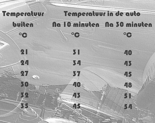 Elke zomer zijn er vooral veel verhalen van mensen die hun hond “eventjes” in de auto achterlaten terwijl ze een boodschap doen. Meestal loopt het nog (net) goed af omdat omstanders ingrijpen en de inzittende uit de hete auto kunnen halen. Met deze hitte werkt zo’n auto als een enorme oven en zelfs in een zeer korte tijd kan dit al desastreuze gevolgen hebben. Je denkt wellicht dat deze waarschuwing overbodig is, maar toch komt menigeen te laat om hun huisdier  te redden die achtergelaten worden in auto’s en oververhit raken.