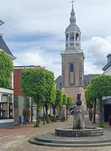 Gaat de fontein ‘Jongen met gans’ gemaakt door Willy Albers Pistorius op de hoek van de Kerkstraat en de Grotestraat ook verdwijnen uit het Almelose stadsbeeld? (foto Partij Vrij Almelo)