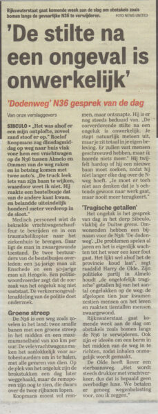 Dit betekent dus voor ons dat verder uitstel van de definitieve aanpak van de dodenweg N36 voor de Partij Vrij Almelo onaanvaardbaar is. Want de N36 in Overijssel behoort tot de gevaarlijkste wegen van Nederland.